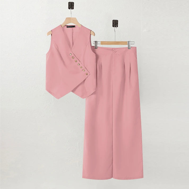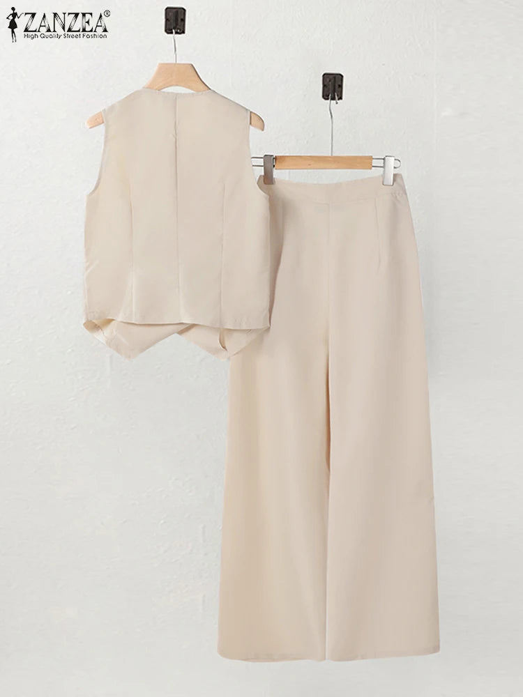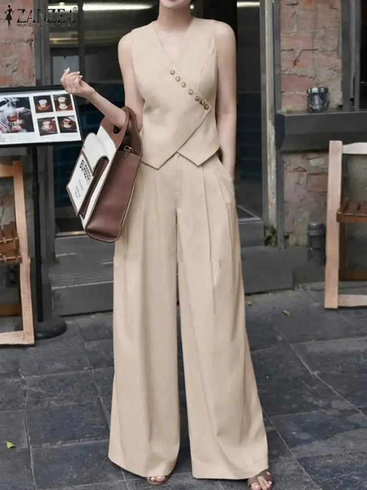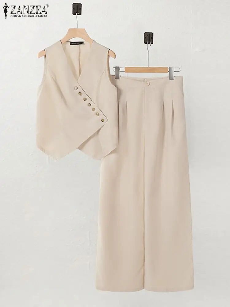 Step into effortless sophistication with the ZANZEA Two-Piece Pant Set, featuring an asymmetrical button vest paired with wide-leg trousers. Perfect for streetwear, office, weddings, parties, or holidays, this set combines European retro charm with modern elegance.